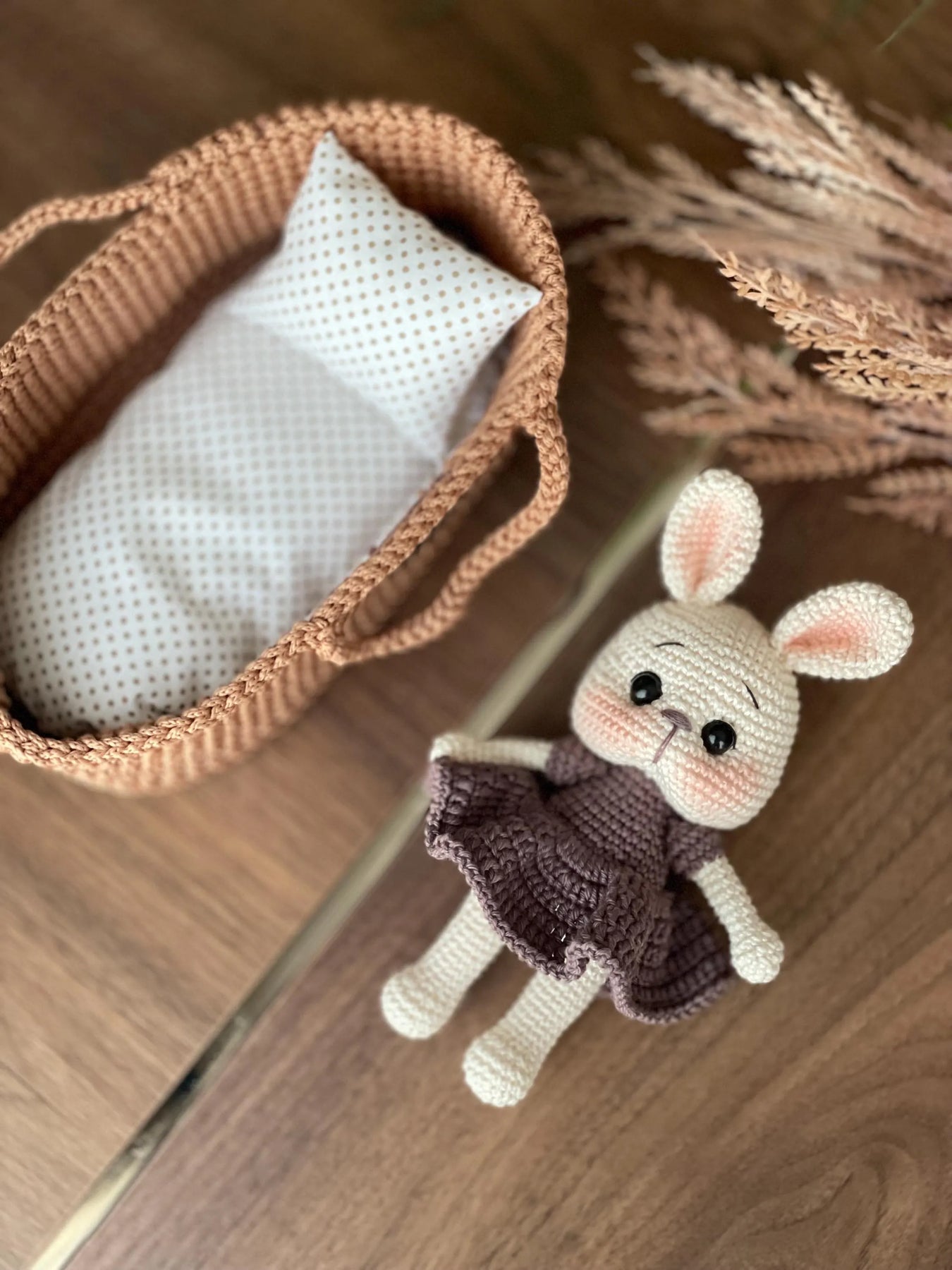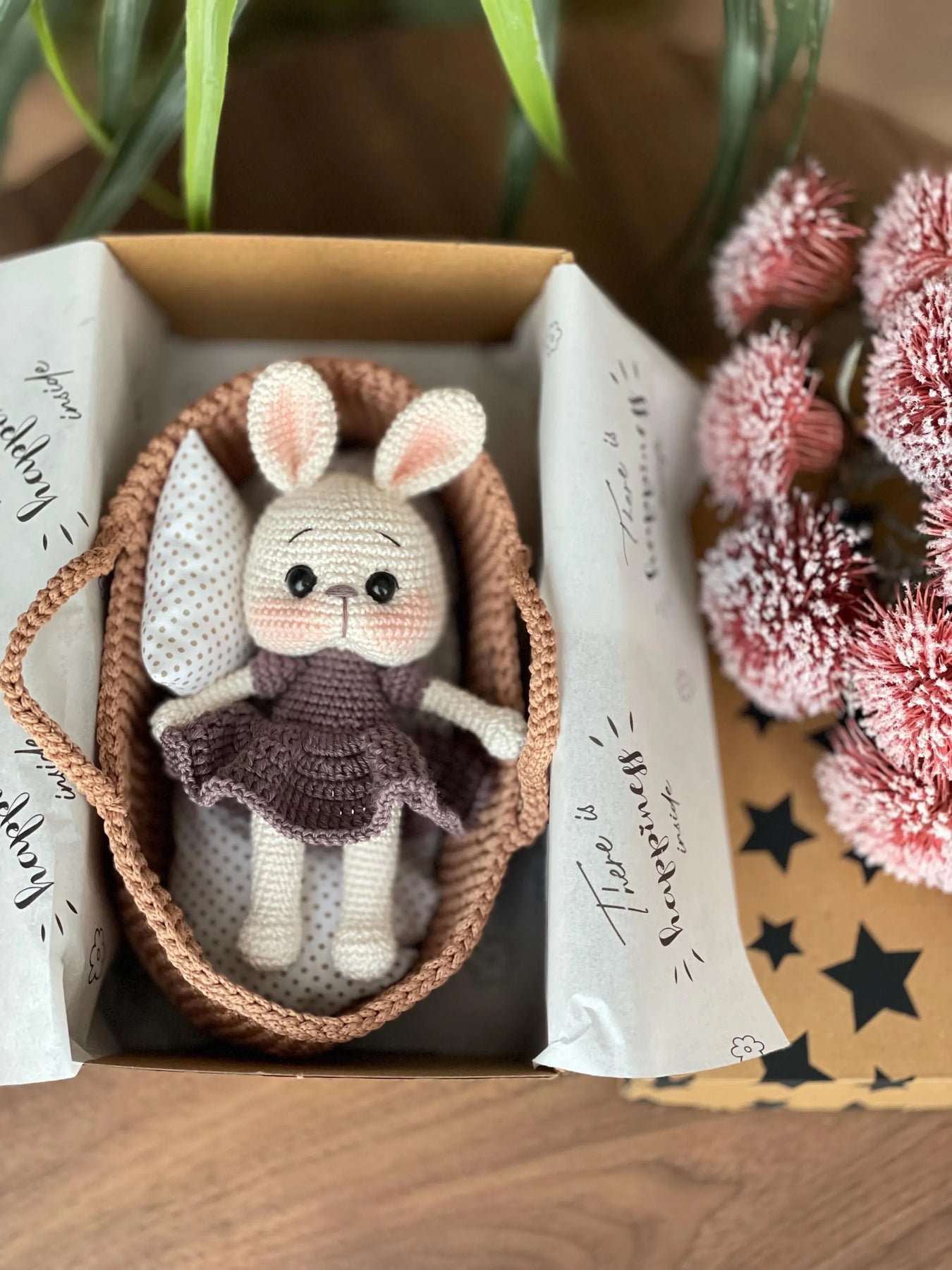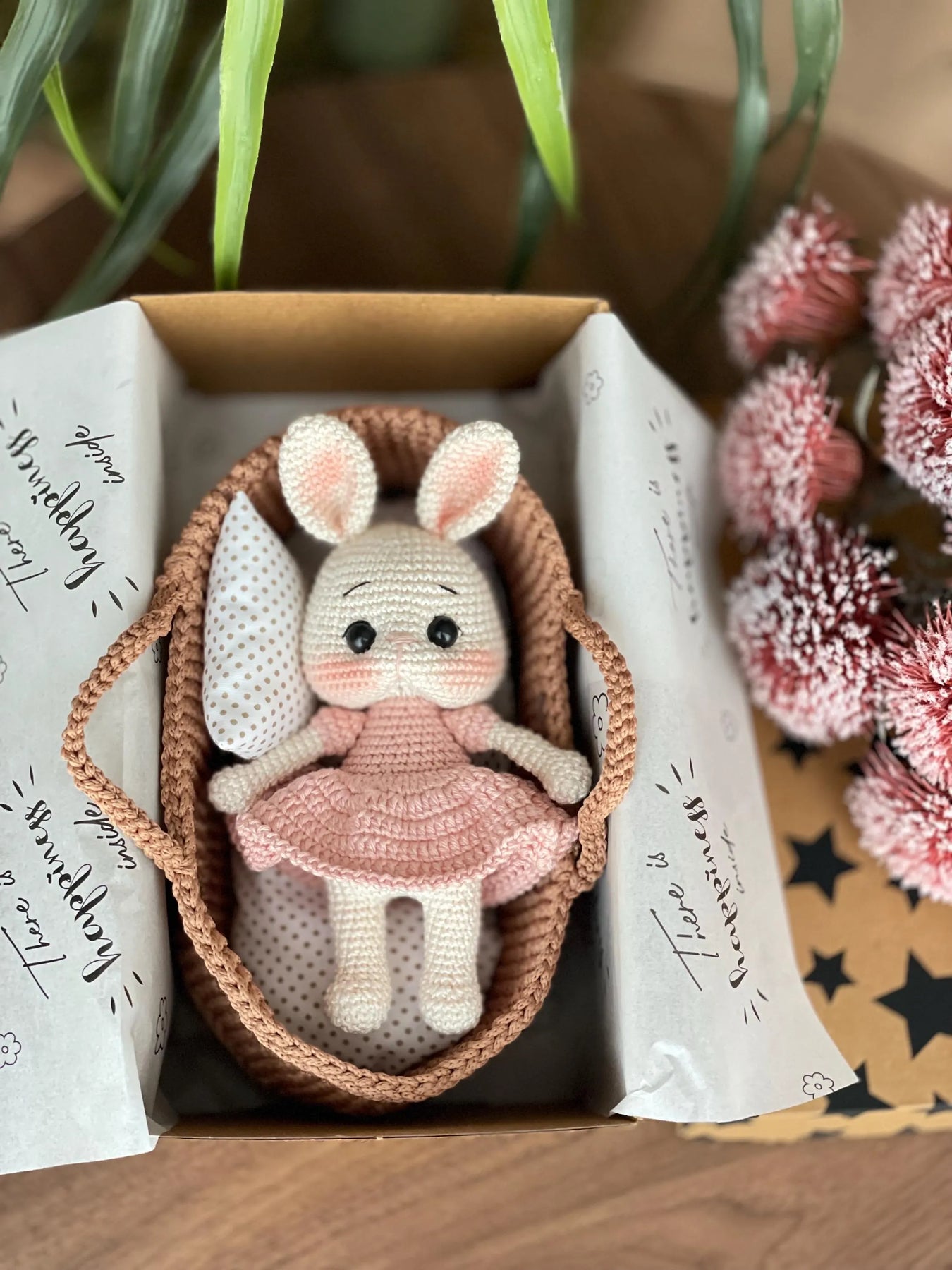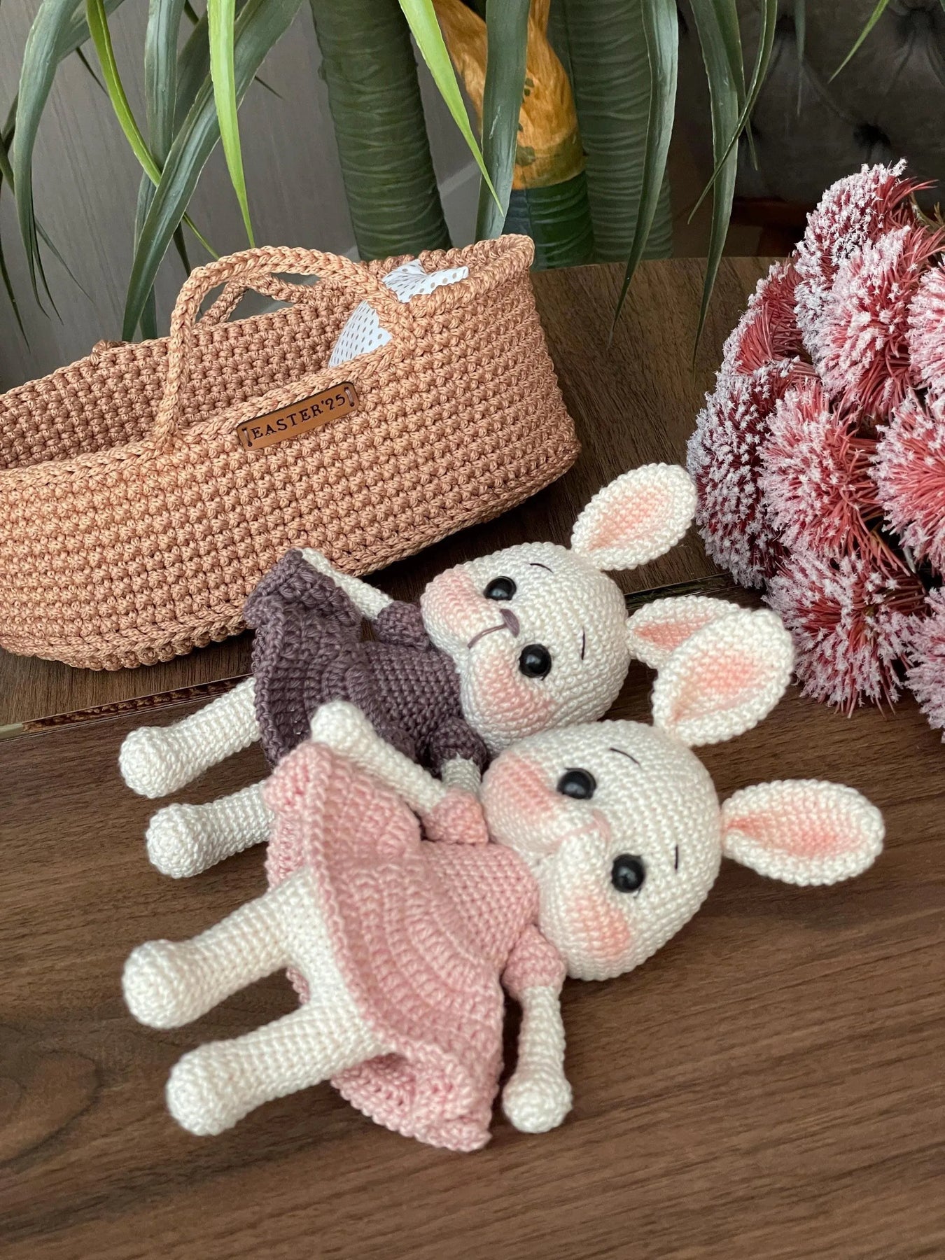 Handmade crochet amigurumi Easter Bunny Toy In The Basket, customized with a leather label, perfect for personalized Easter gifts or baby showers.