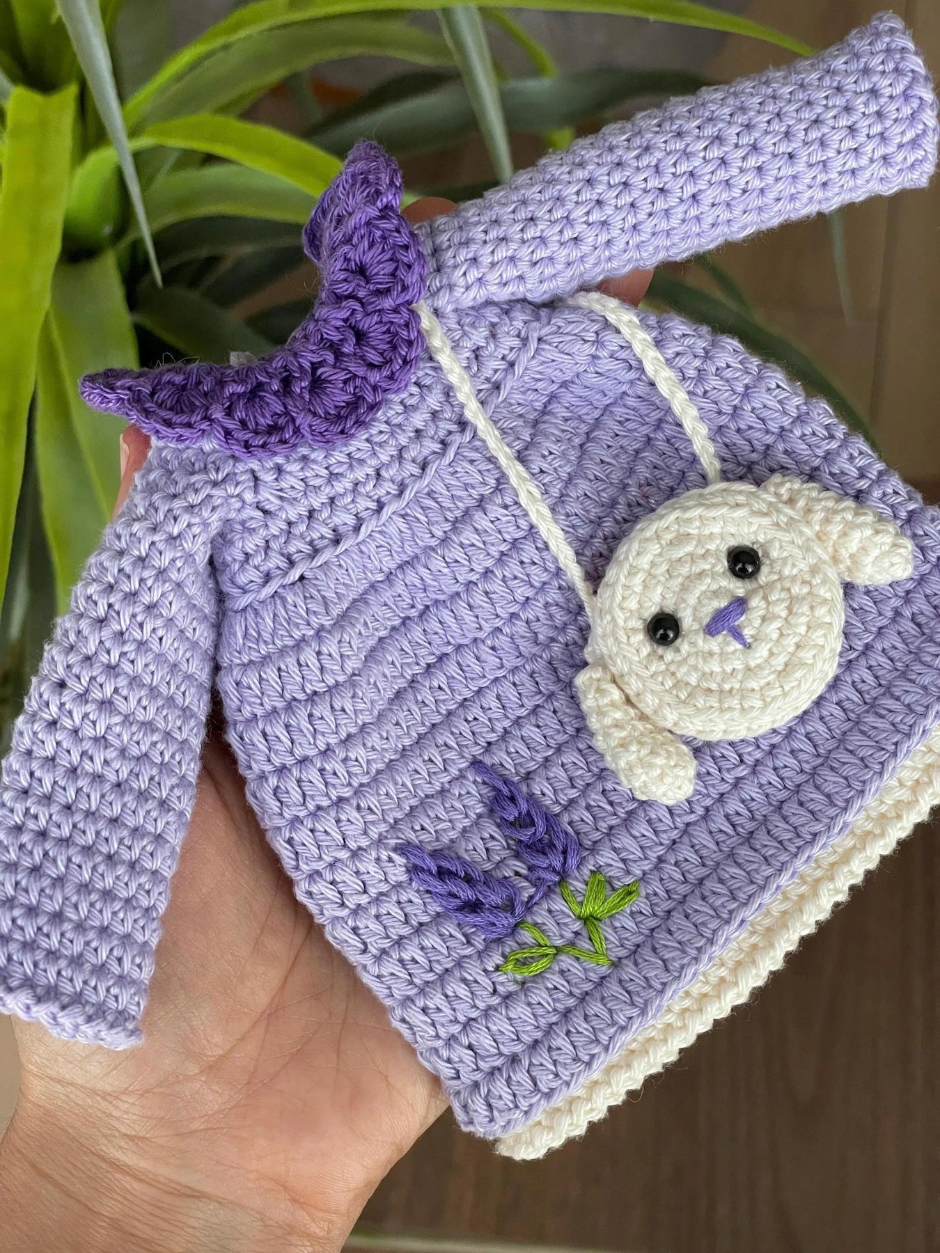 ♡ Handmade Curly Girl Doll With Shoulder Bag with a rosemary/lavender outfit, crafted using amigurumi crochet technique, personalized with a name on a leather label, ideal for gifts.