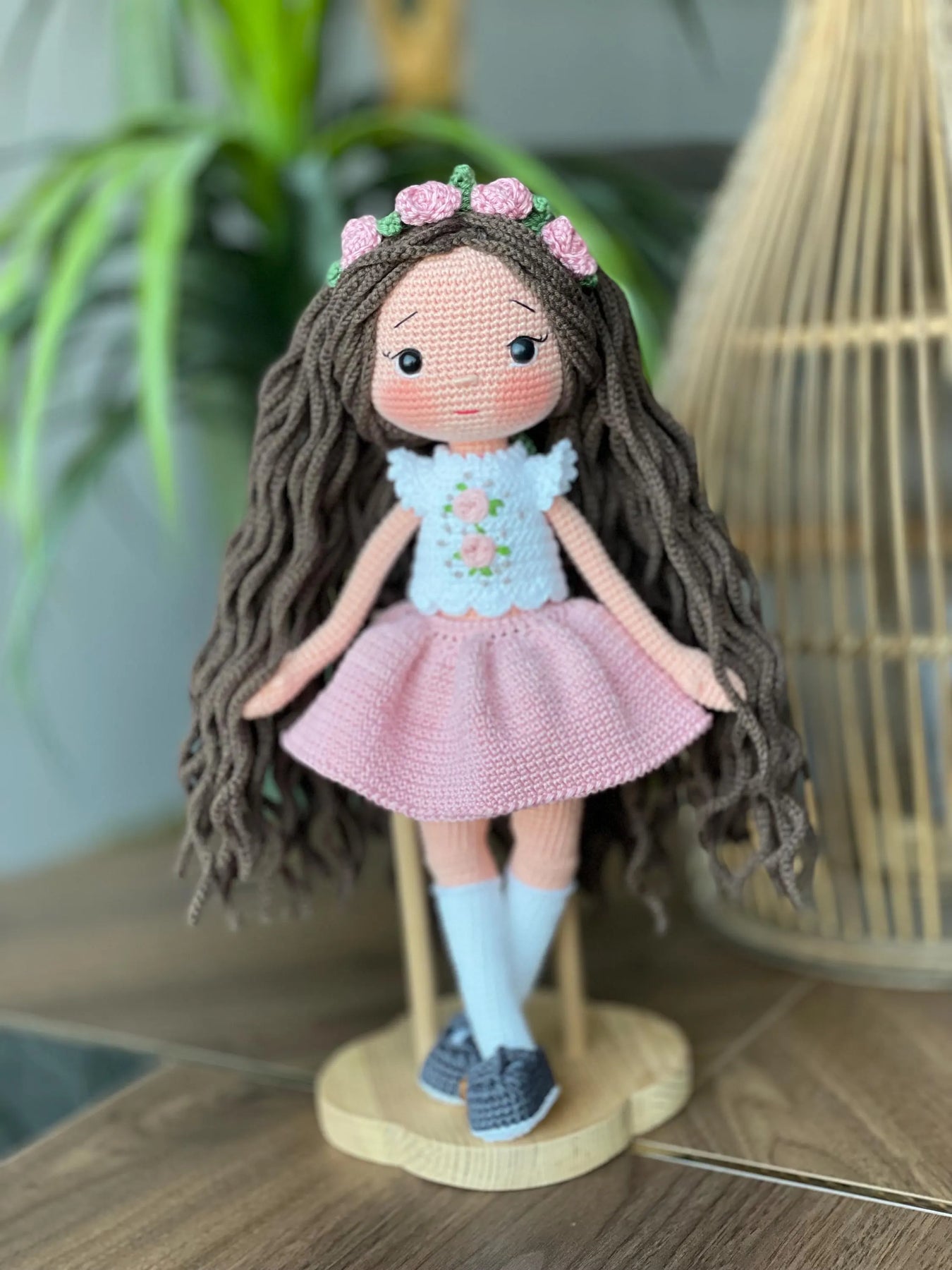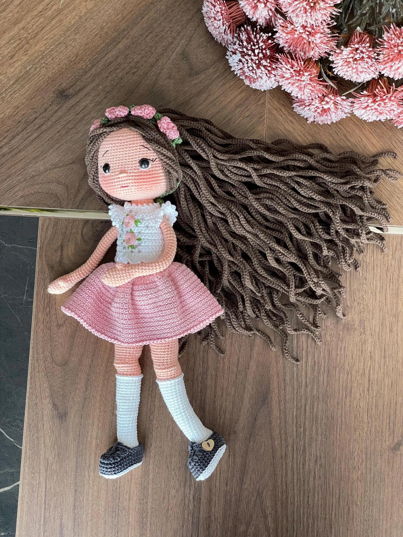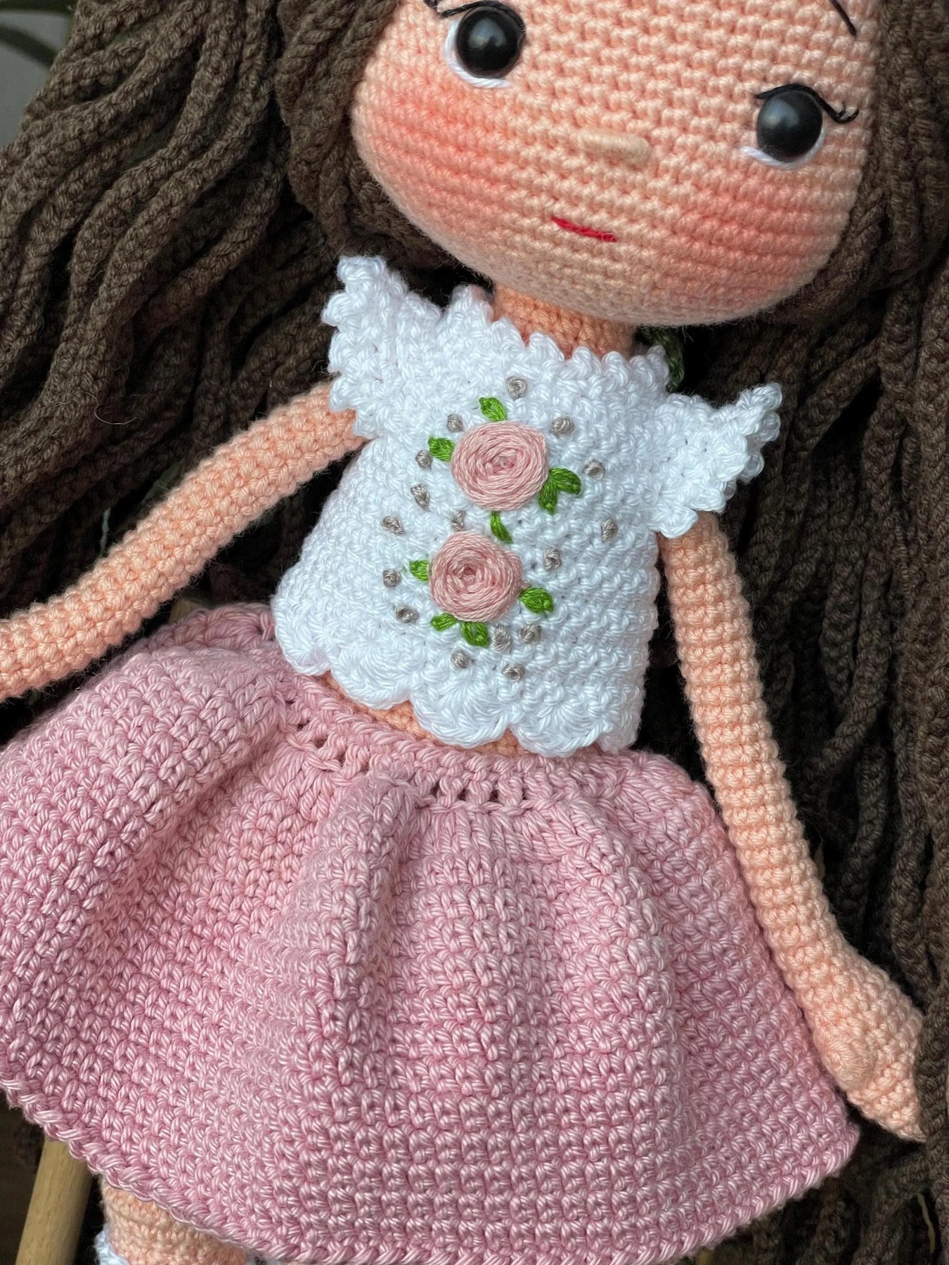 ♡ Handmade crocheted Olivia Doll with long brown hair, a white floral tshirt and a pink skirt, customizable with a name on a leather label. Perfect for nursery decor and as a personalized gift.
