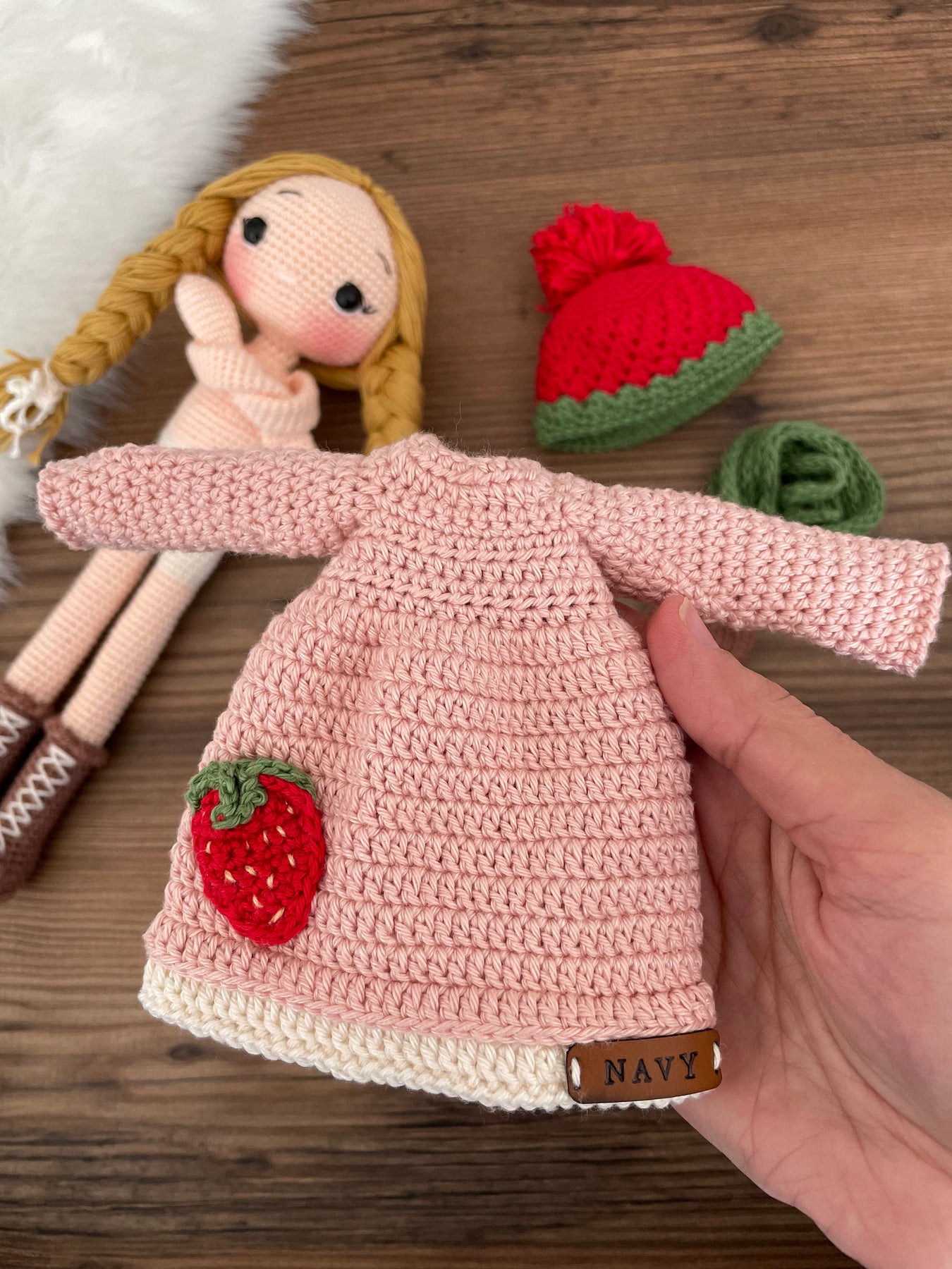 Handmade crocheted Strawberry Girl Doll featuring a pink dress, strawberry detail, and a cute braided hairstyle. Customizable with a name on a leather label, made using amigurumi techniques. Perfect as a personalized gift or nursery decor.